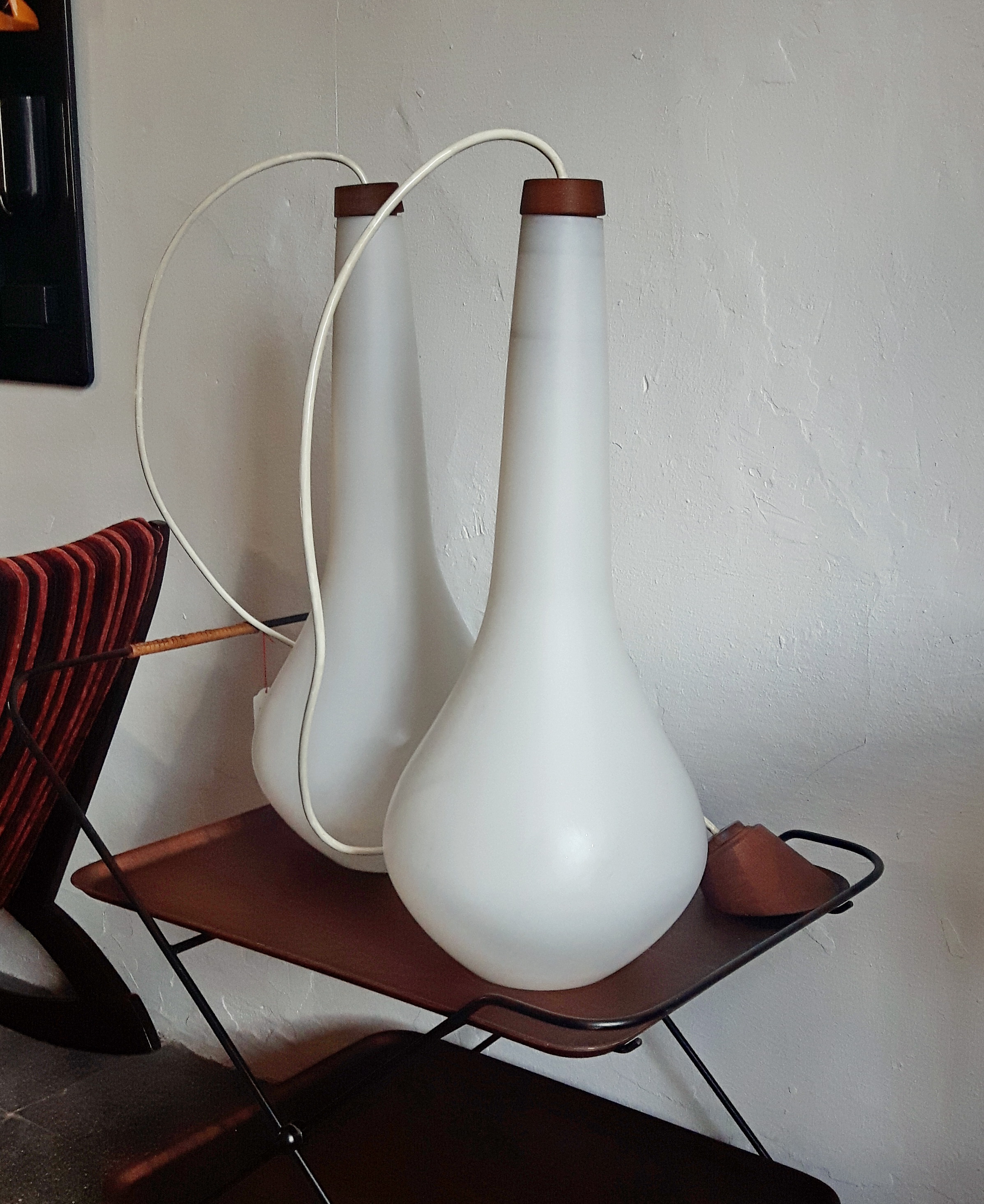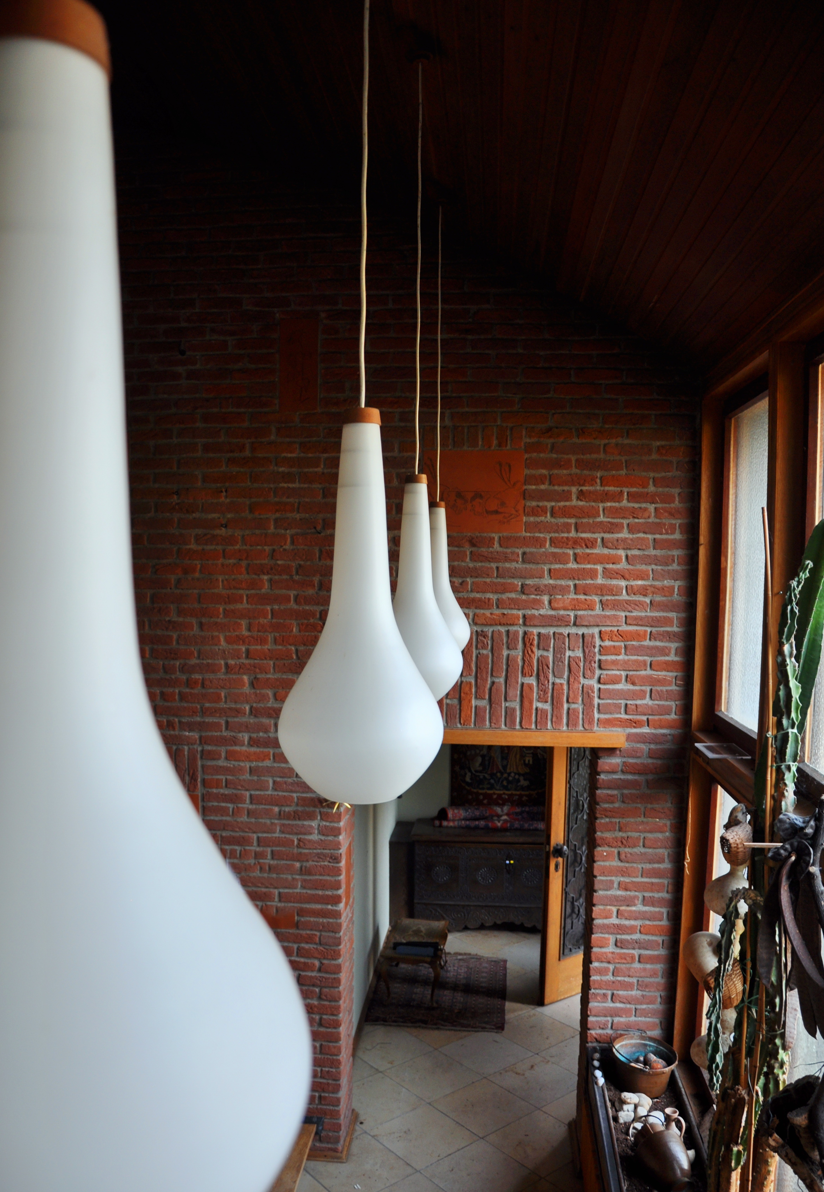 exceptional set of 5 danish pendants around 1960. they hung in a large hallway of an important architects mansion. the whole building was ’scandinavian orientated‘. as example i attached a pic from the ‚wiking-fireplace‘ in the livingroom (wich is a manifestation of my childhood dream!). the lights are made of opal-glass (white glass covered with transparent glass and then etched for absolute non blinding light), not to be confused with opalineglass, wich has a touch of blue.
