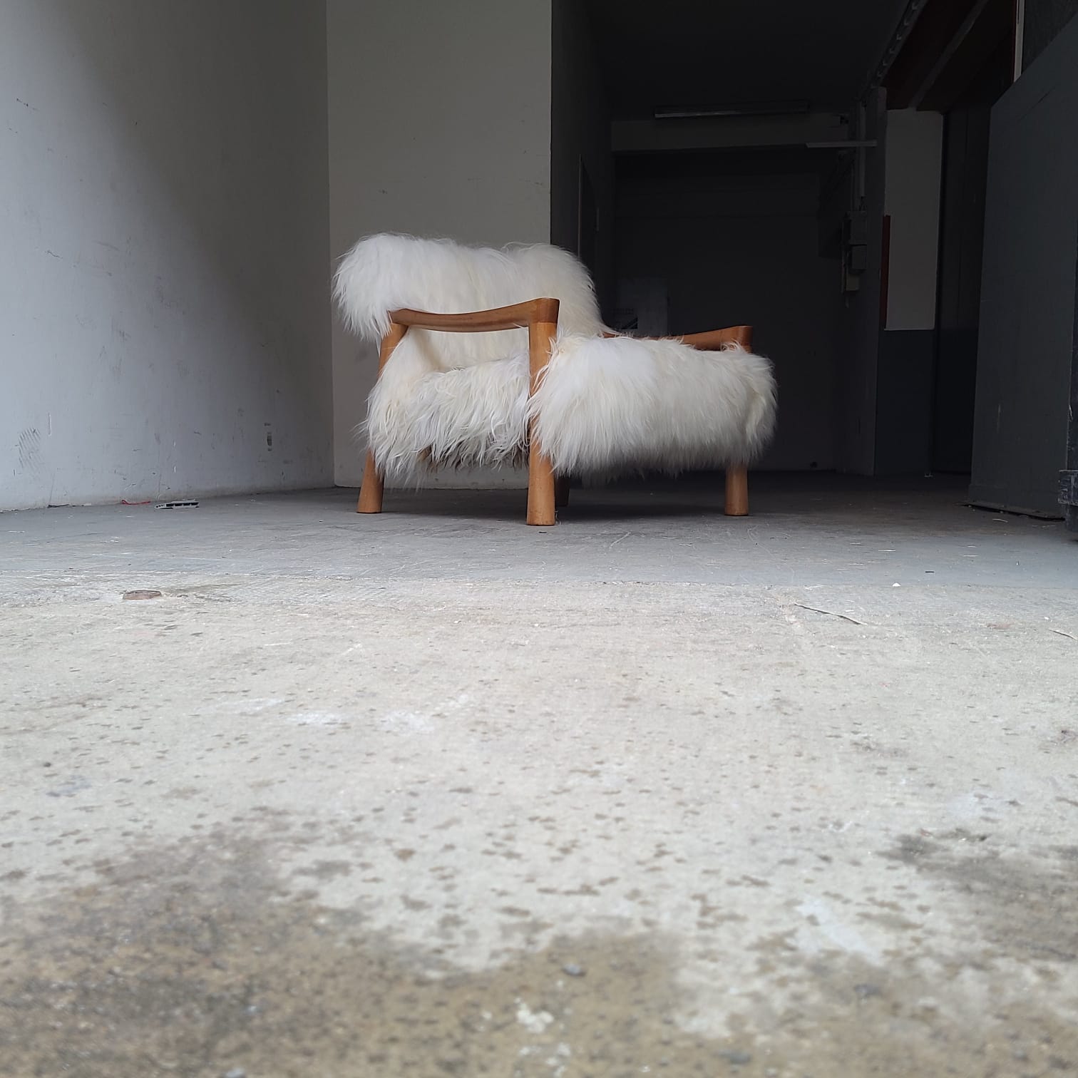 ausgefallener 70er jahre sessel (beine haben irgendwas von bein/huf), neu gepolstert mit hochland langhaarziege.