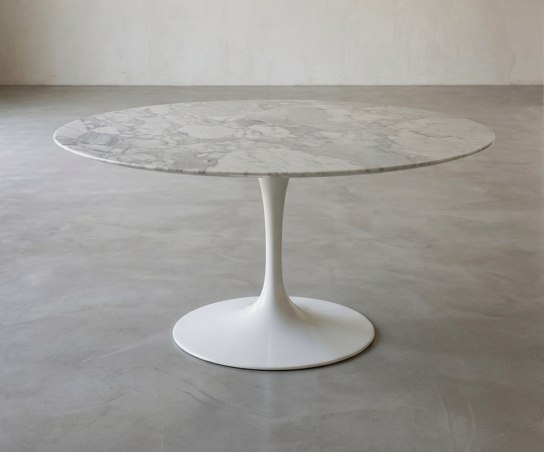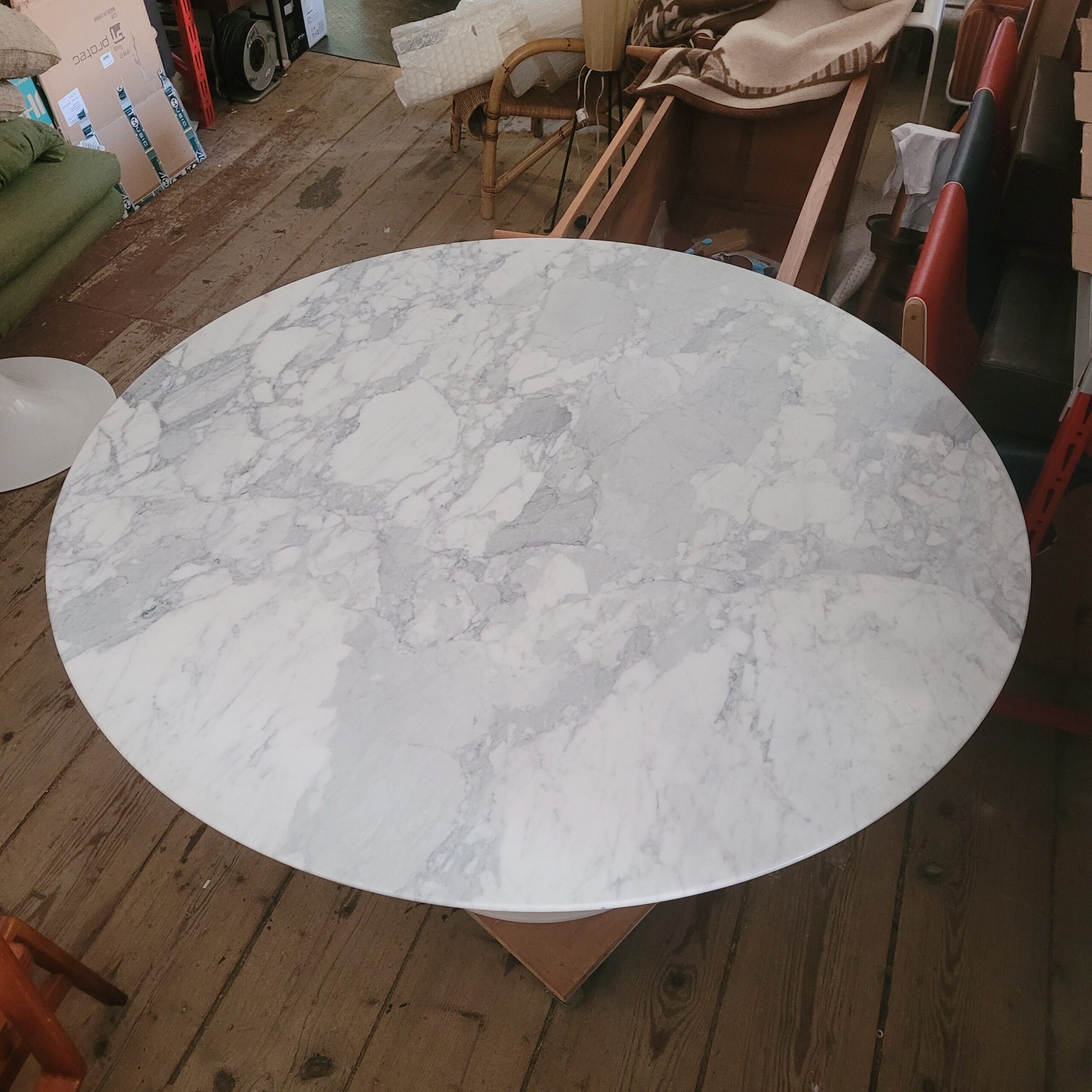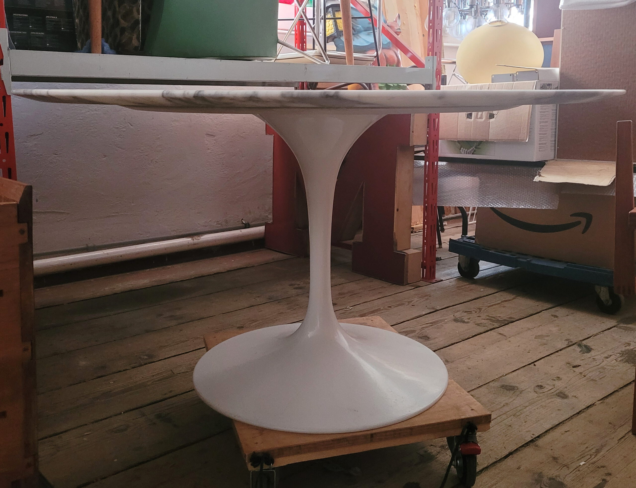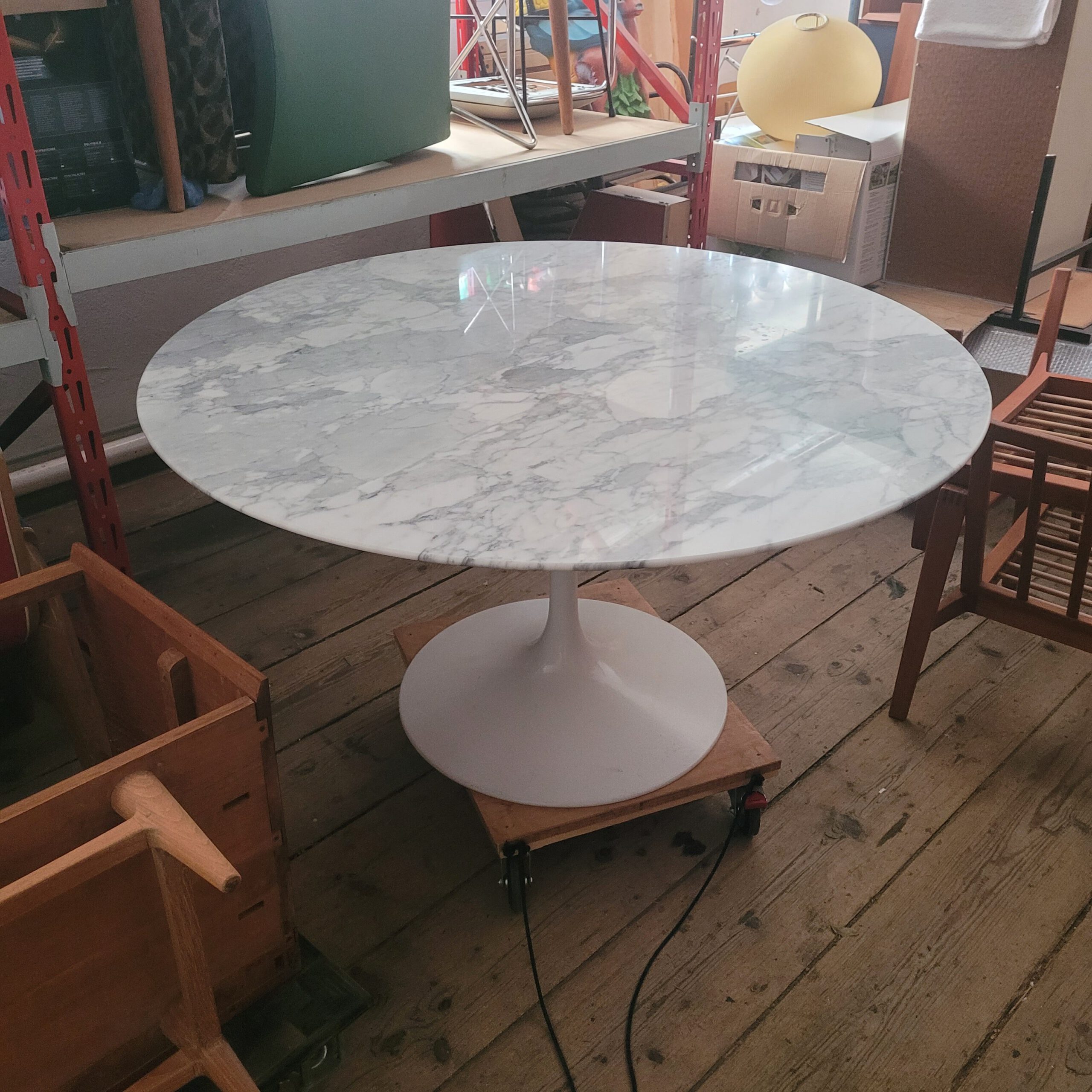 eero saarinen tulip esstisch design 1956 für knoll international, platte marmor arabescato (weiß mit grauen einschlüssen), durchmesser ca. 140cm, höhe ca 72cm.